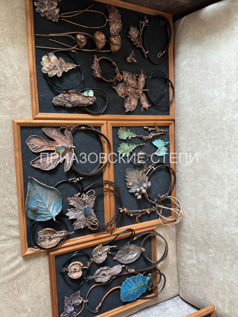 По образованию Галина Юдачёва экономист, работала продавцом. Сколько себя помнит, всё время занималась чем-то творческим: вышивала, плела из бумажной лозы. Но гальванопластика отличалась от всего ранее виденного. Особенно отсутствием ограничений фантазии: любой листик, ракушка, палочка могут стать оригинальным украшением, навсегда погрузившись в медный саркофаг. Изготовление изделия длится несколько дней. Я попала как раз на момент, когда в растворе на одной проволоке висели листья, а на другой – медные пластинки. В результате действия тока (одна проволока являлась катодом, другая – анодом, соответственно) ионы меди, отделяясь от своей пластинки, оседали на растительном материале. Затем листики ждёт «отбел» в растворе с лимонной кислотой и патенирование. Так просто всё звучит в устах Галины, но на выходе получаются настолько уникальные украшения, что мастер уже дважды становилась обладателем Гран-при на всероссийском и международном фестивалях творчества. На сегодня Юдачёва единственная, кто укрощает медь в Ейске и, похоже, в крае. Третья победа может принести ей «Золотого Пегаса», как уникальному мастеру.