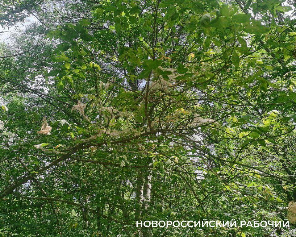 Новороссийцы выкладывают в соцсетях фотографии деревьев, чья листва заплетена паутиной и уничтожается гусеницами.